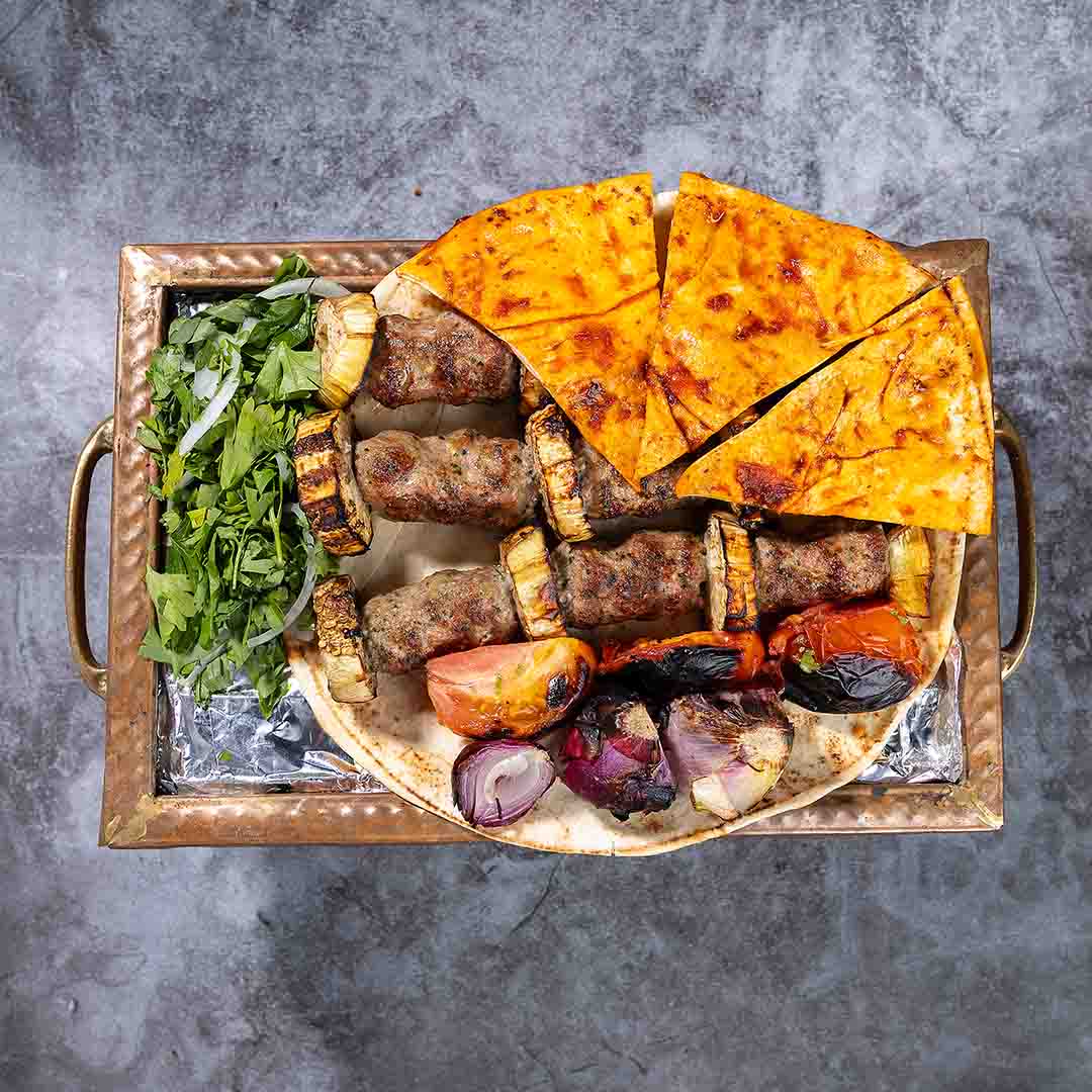لحم مفروم مع بصل - باذنجان مشوي - طماطم مشوية - دبس الرمان