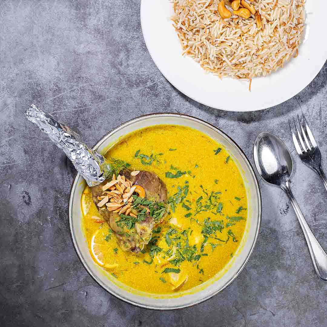 موزة غنم مع صوص الخضار والليمون يقدم مع الأرز