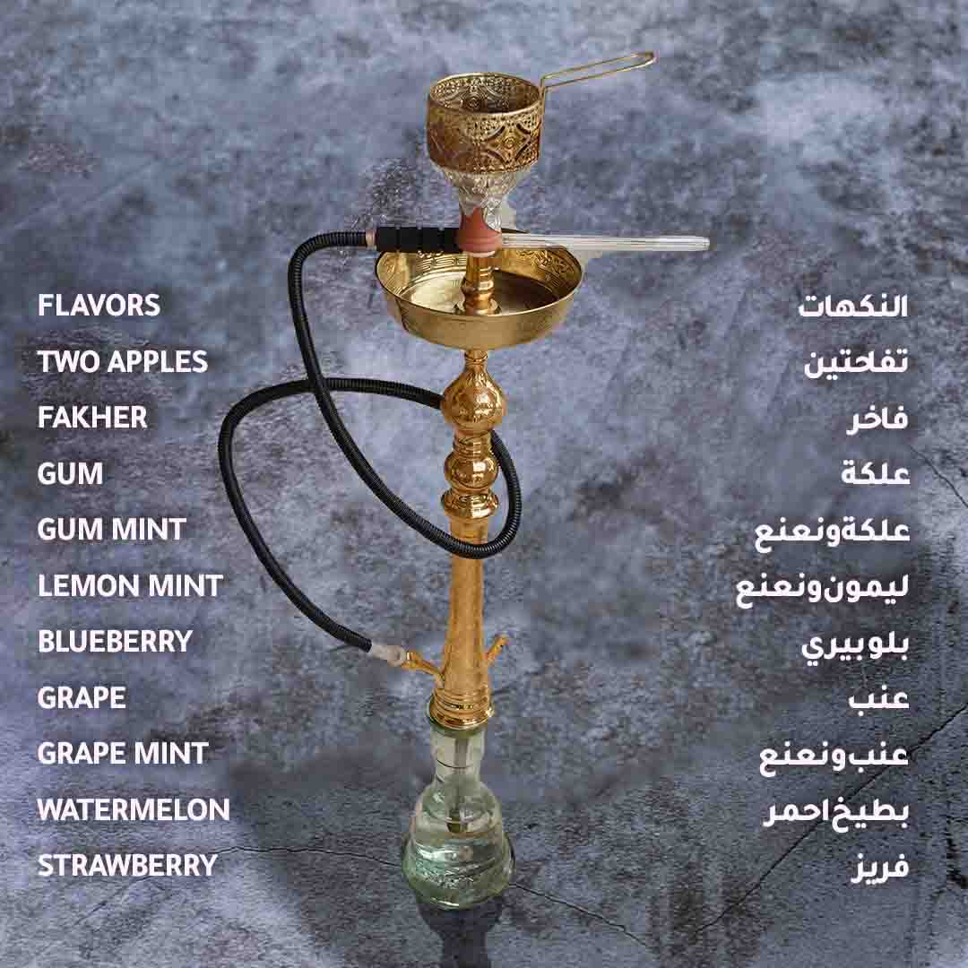 النكهات تفاحتين فاخر علكة علكة ونعنع ليمون ونعنع بلو بيري عنب عنب ونعنع بطيخ احمر فريز